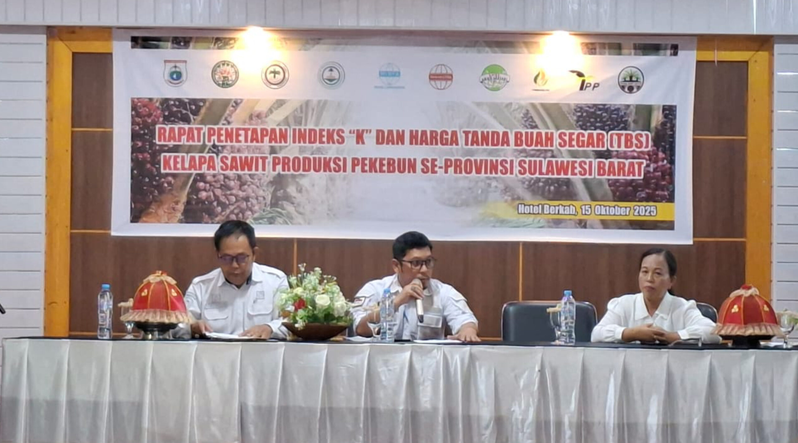 Dinas Perkebunan Provinsi Sulawesi Barat (Sulbar) menggelar Rapat Penetapan Indeks “K” dan Harga Tandan Buah Segar (TBS) Kelapa Sawit produksi pekebun se-Sulawesi Barat untuk periode September 2025. Kegiatan ini berlangsung di Hotel Berkah, Jalan Soekarno Hatta, Mamuju, pada Kamis (11/09/2025).